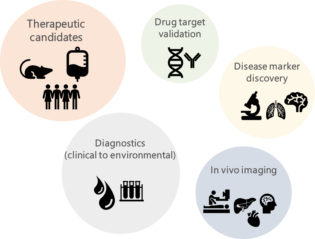 Reformatted antibody fragments and mAbs can be produced in bacterial or mammalian expression systems for various biochemical and biophysical characterisations, functional assays and in vivo models.