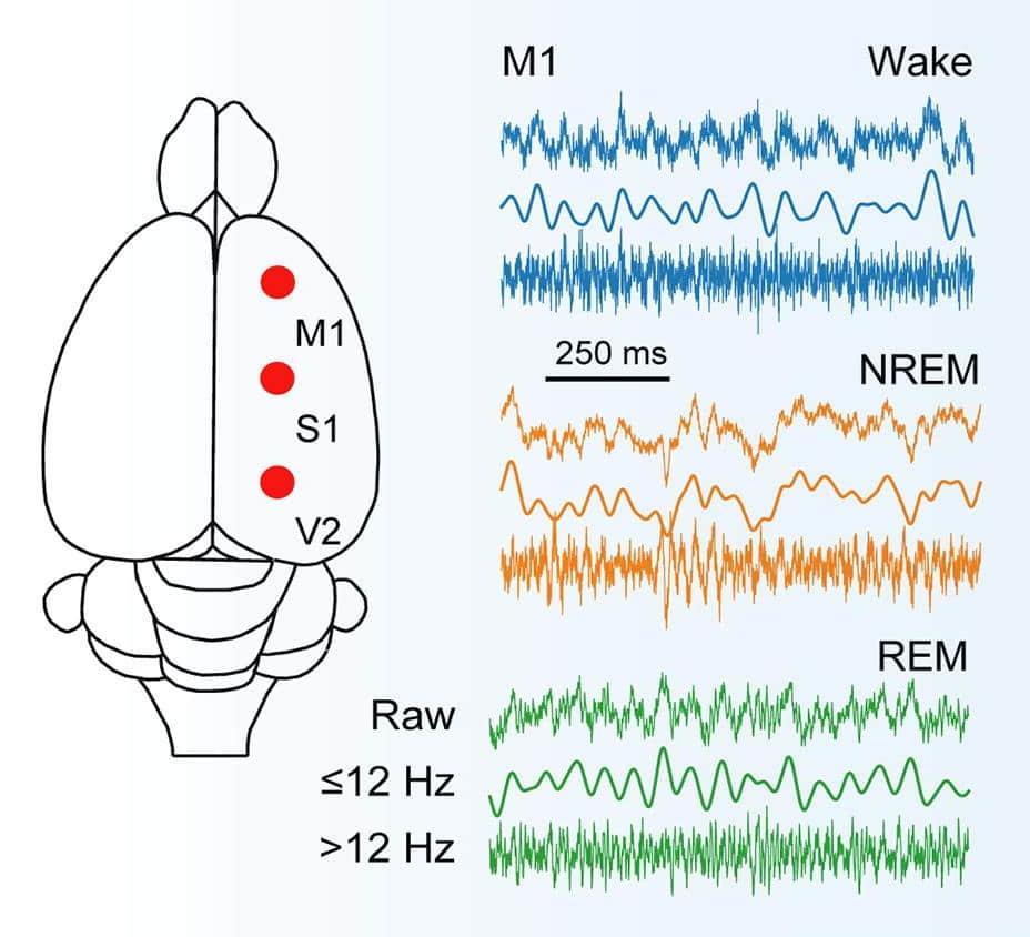 Right: Rat intracranial EEG showing brain schematic and sensor locations, and recordings for wakefulness, REM sleep, and non-REM sleep. From González et al. (2022).