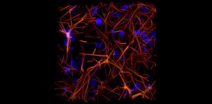 Figure: The structure of a clot showing fibrin (red) and procoagulant platelets (blue)
