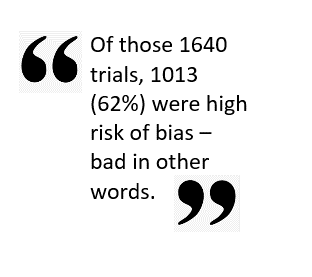 Our results were recently published in Trials. Our starting point was very recent Cochrane systematic reviews, studies that look at large numbers of trials to see what the combined evidence says about the effect of a particular treatment. Cochrane reviews also record review authors’ judgements about what is called the ‘risk of bias’ of each of trial in the review. What this means is that they assess in a standardised way the extent to which a trial’s findings can be believed. Risk of bias can be whittled down to three flavours: high, uncertain and low. Low risk of bias is good; high risk of bias is bad. Uncertain risk of bias is exactly that, uncertain. It could be good, it could be bad but there isn’t enough information to be sure.