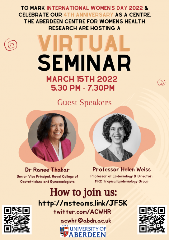 The Aberdeen Centre for Women’s Health Research are hosting a virtual seminar event via MS Teams on Tuesday the 15th of March between 5.30pm- 7.30pm. The event is to celebrate the fourth anniversary of the Centre and to mark International Women’s Day 2022 in collaboration with the Royal College of Obstetrics and Gynaecology.