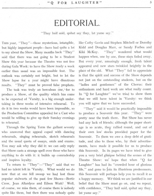 'Q for Laughter' was an amazing Show and that it was ever staged was a miracle. For some reason His Majesty's Theatre was not available during Gala Week, hence the Show had to be staged a week earlier than usual. To produce a Show of quality in three weeks is difficult enough, but in two -- ! We gave up Sunday evenings and coped with rehearsals and the usual quota of essays, orals and exams. As editor of the Souvenir I wrote about it, so I remember it well. I also remember how difficult it was to get any paper for printing the Souvenir, but our paper company friends rallied round and provided paper from their own low stocks.