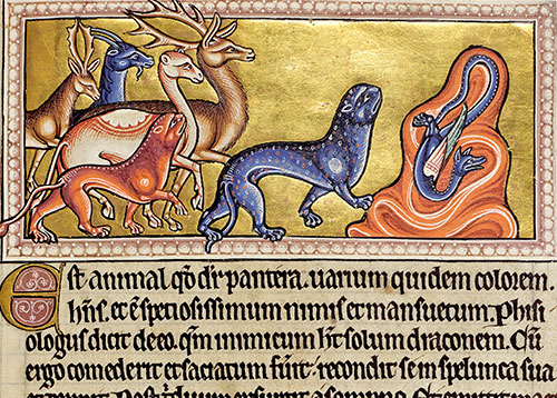 The Aberdeen Bestiary (Aberdeen University Library MS 24) is considered to be one of the best examples of its type due to its lavish and costly illuminations. The manuscript, written and illuminated in England around 1200, is of added interest since it contains notes, sketches and other evidence of the way it was designed and executed.
