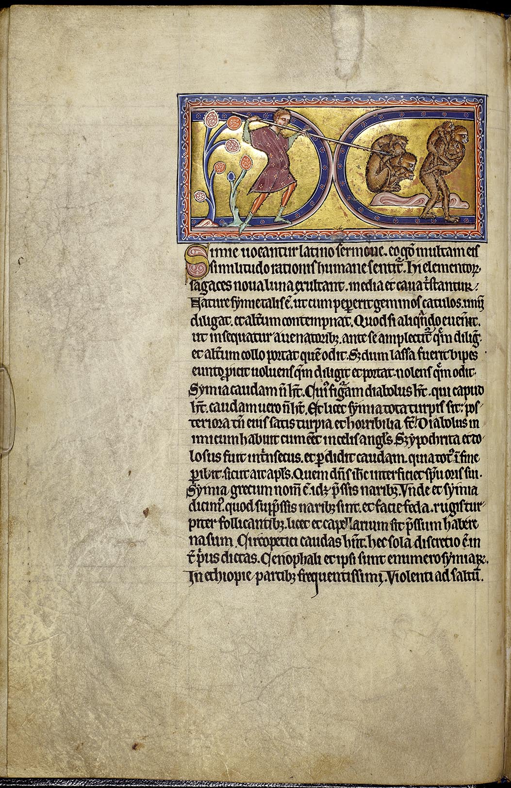 Simie vocantur latino sermone, eo quod multam eis\ similitudo rationis humane sentitur. Hi elementorum\ sagaces nova luna exultant, media et cava tristantur.\ Nature symie talis est, ut cum peperit geminos catulos, unum\ diligat, et alterum contempnat. Quod si aliquando evenerit\ ut insequatur a venatoribus, ante se amplectitur quem diligit\ et alterum collo portat quem odit. Sed dum lassa fuerit bipes\ eunto proicit voluens quem diligit et portat nolens quem odit.\ Symia caudam non habet. Cuius figuram diabolus habet, qui capud\ habet, caudam vero non habet. Et licet symia tota turpis sit, pos\teriora tamen eius satis turpia et horribilia sunt. Diabolus in\imicum [A: initium] habuit cum esset in celis angelus. Sed ypochrita et do\losus fuit intrinsecus, et perdidit caudam, quia totus in fine\ peribit, sicut ait apostolus: Quem dominus Iesus interficiet spiritu oris sui.\ Symia grecum nomen est, id est, pressis naribus. Unde et symia\ dicimus, quod suppressis naribus sint, et facie feda, rugis tur\piter follicantibus, licet et capellarium [A: capellarum] sit pressum habere\ nasum. Circopetici caudas habent. Hec sola discretio est in\ter prius dictas. Cenophali et ipsi sunt e numero symiarum.\ In Ethiope partibus frequentissimi. Violenti ad saltum\Translation