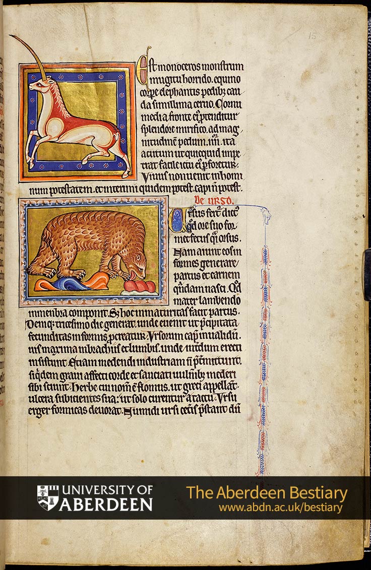 Est monoceros monstrum\ mugitu horrido, equino\ corpore elephantis pedibus, cau\da simillima cervo. Cornu\ media fronte eius protenditur\ splendore mirifico, ad mag\nitudinem pedum quatuor, ita\ acutum ut quicquid impe\trat [A: impetat] facile ictu eius foretur.\ Vivus non venit in homi\num potestatem, et interimi quidem potest, capi non potest.\ De urso\ Ursus fertur dictus\ quod ore suo for\met fetus quasi orsus.\ Nam aiunt eos in \ formes generare\ partus et carnem\ quandam nasci. Quod\ mater lambendo\ in membra componit. Sed hoc inmaturitas facit partus.\ Denique tricesimo die generat, unde evenit ut precipitata\ fecunditas informis procreatur. Ursorum caput invalidum,\ vis maxima in brachiis et lumbis, unde interdum erecti\ insistunt. Etiam medendi industriam non pretermittunt.\ Siquidem gravi affecti corde [A: caede] et sauciati vulneribus mederi\ sibi sciunt. Herbe cui nomen est flomus, ut greci appellant,\ ulcera subicientes sua, ut solo curentur a tactu. Ursu\ erger formicas devorat. Numidi ursi ceteris prestant dum\Translation