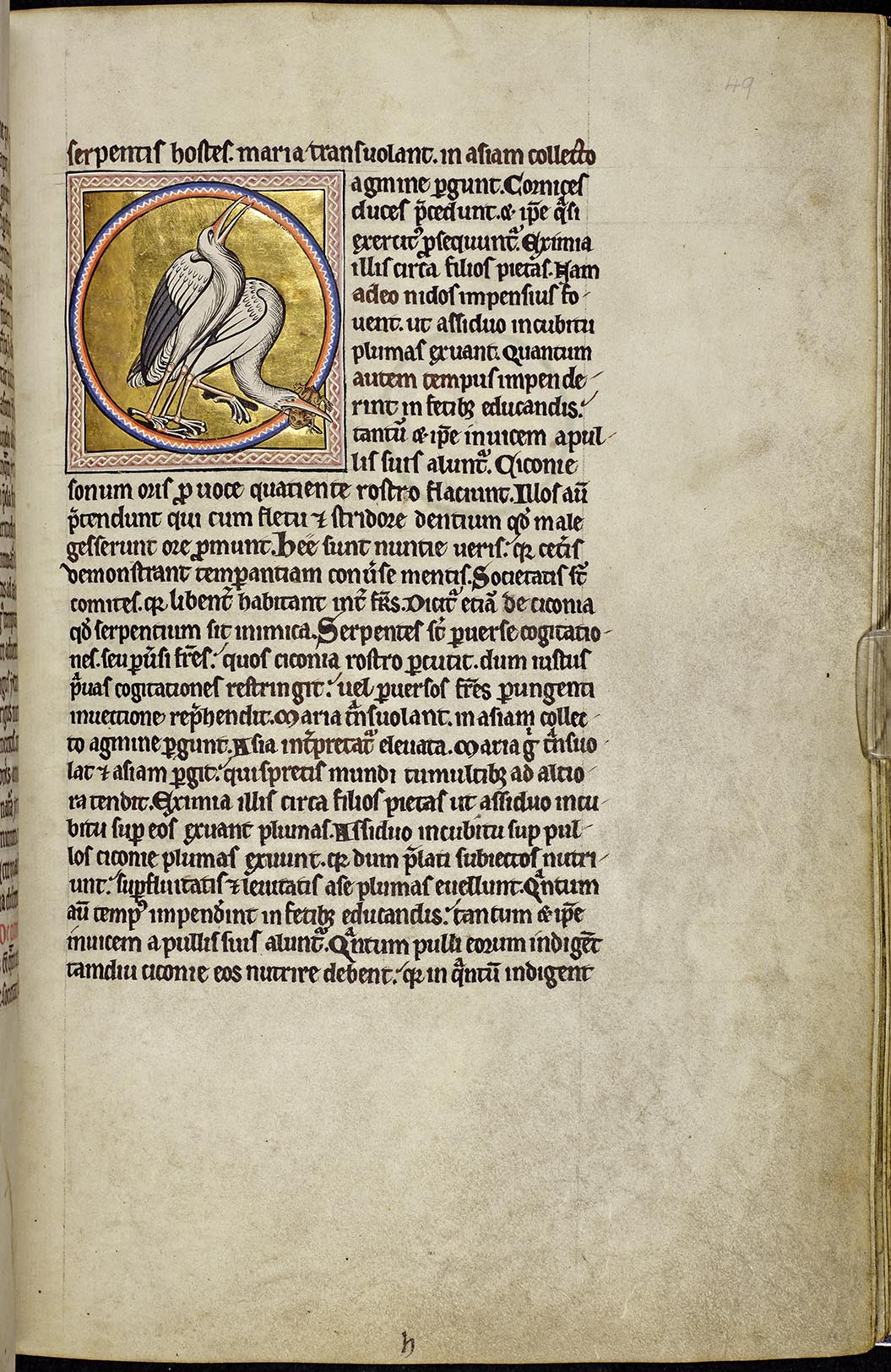 Although the stork is only recorded once in the middle ages as a visitor to Britain, the Aberdeen artist has created a remarkably accurate portrait of the bird (and the frog). The original source for the illustration must have been made on the Continent by someone who had observed storks. There is a quire mark ('h') at the bottom centre of the page.