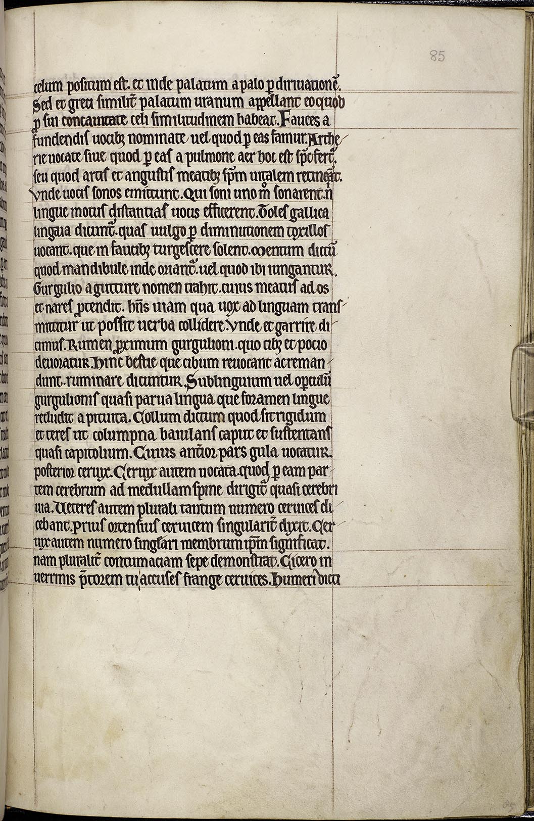celum positum est, et inde palatum a palo [PL, polo] per dirivationem.\ Sed et Greci similiter palatum uranum appellant eo quod\ pro sui concavitate celi similitudinem habeat. Fauces a\ fundendis vocibus nominate vel quod per eas famur. Arthe\rie vocate sive quod per eas a pulmone aer hoc est spiritus fertur,\ seu quod artis et angustis meatibus spiritum vitalem retineant.\ Unde vocis sonos emittunt. Qui soni uno modo sonarent, nisi\ lingue motus distantias vocis efficerent. Toles Gallica\ lingua dicuntur, quas vulgo per diminutionem toxillos\ vocant, que in faucibus turgescere solent. Mentum dictum\ quod mandibule inde oriantur, vel quod ibi iungantur.\ Gurgulio a gutture nomen trahit, cuius meatus ad os\ et nares protendit, habens viam qua vox ad linguam trans\mittitur ut possit verba collidere. Unde et garrire di\cimus. Rumen proximum gurgulioni, quo cibus et pocio\ devoratur. Hinc bestie que cibum revocant ac reman\dunt, ruminare dicuntur. Sublinguium vel operculum\ gurgulionis quasi parva lingua que foramen lingue\ recludit a pituita. Collum dictum quod sit rigidum\ et teres ut columpna baiulans caput et sustentans\ quasi capitolium. Cuius anterior pars gula vocatur,\ posterior cervix. Cervix autem vocata, quod per eam par\tem cerebrum ad medullam spine dirigitur quasi cerebri\via. Veteres autem plurali tantum numero cervices di\cebant. Prius Ortensius cervicem singulariter. Cer\ vix autem numero singulari membrum ipsum significat,\ nam pluraliter contumaciam sepe demonstrat. Cicero in\ Verrinis: Pretorem tu accuses frange cervices. Humeri dicti\Translation