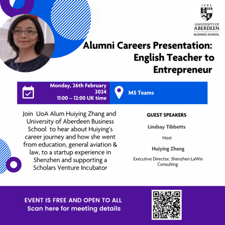 Join UoA Alum Huiying Zhang and University of Aberdeen Business Schoolto hear about Huiying’s career journey and how she went from education, general aviation & law, to a startup experience in Shenzhen and supporting a Scholars Venture Incubator.