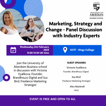 Join the University of Aberdeen Business school in discussion with Victoria Vyalikova, Founder, Brandhouzz Digital and Suz Bird, Freelance Marketing Strategist.