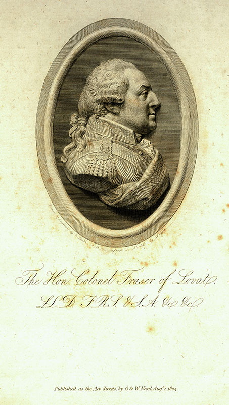 son of Simon, 12th Baron Lovat, by his father's instructions headed the Frasers in support of Prince Charles Edward; DNB; (a) A Smith after a model by Tussie; (e) A Smith; (p) G & W Nicol; 1804; 11.3 x 8 cms.