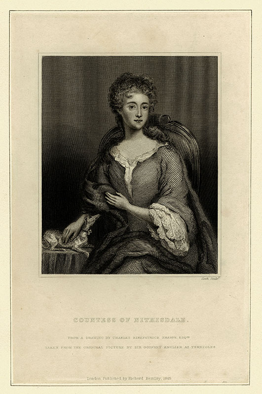 fruitlessly petitioned George I, 1716, for the life of her husband, William Maxwell, sentenced to death for his share in the rebellion of 1715, enabled him to escape from the Tower of London, 1716; DNB; (a) C K Sharpe after G Kneller; (e) J Cook; (p) R Bentley; 1845; 11.1 x 9 cms.