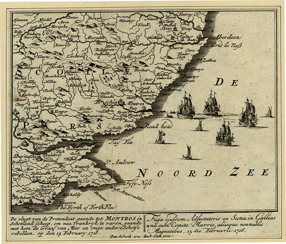 escape of the Old Pretender, James Francis Edward Stuart, and the Earl of Mar, to France from Montrose, 15 February, 1716, (4 February Old Style date); (a) Schenk; 15.8 x 18.4 cms.