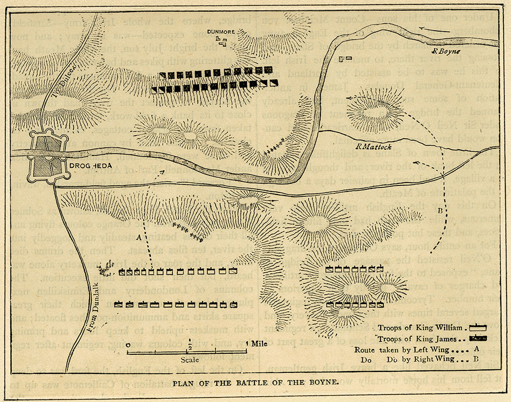 plan of the Battle at which William III defeated James II and Irish-French army, 1 July 1690; 10.6 x 14.4 cms.
