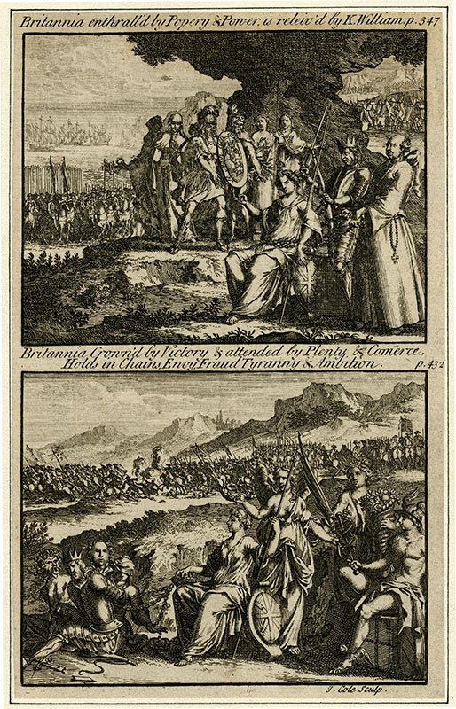 (i) being released from the bonds of Popery by the victorious William III and (ii) resuming command after the Battle of the Boyne, 1690; satire; (e) J Cole; 17 x 10.3 cms.