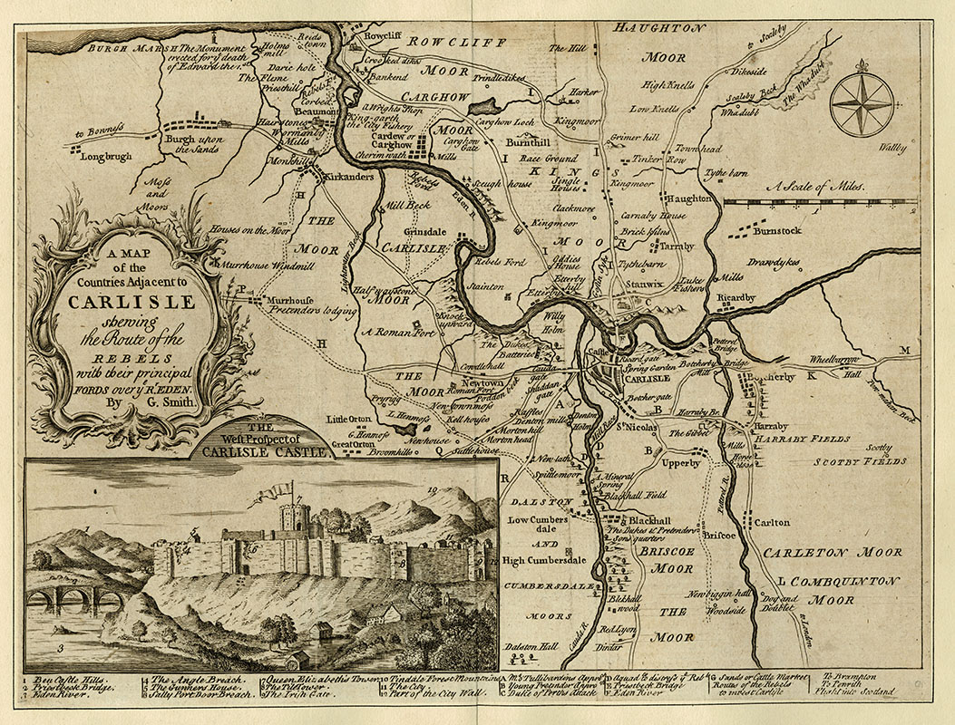 map of the area showing the route followed by the Jacobites, November 1745, view of the castle; (e) G Smith; 20.1 x 26.5 cms.