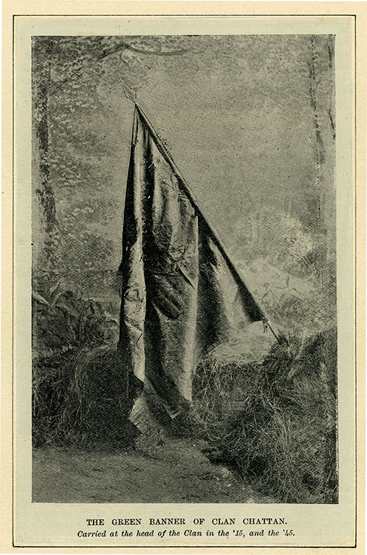 the green banner carried at the head of the Clan in the 1715 and 1745 Jacobite risings; 13 x 8.5 cms.