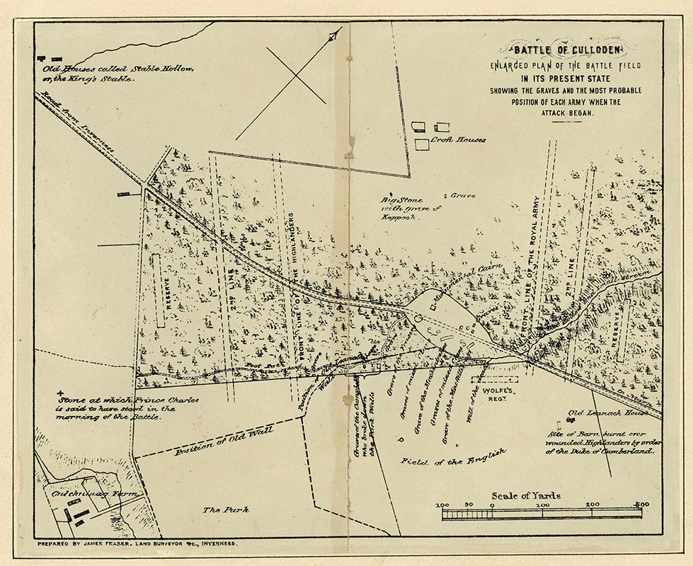 plan of the battle-field showing the graves and the most probable position of each army when the attack began; (e) J Fraser; 14.5 x 17.7 cms.