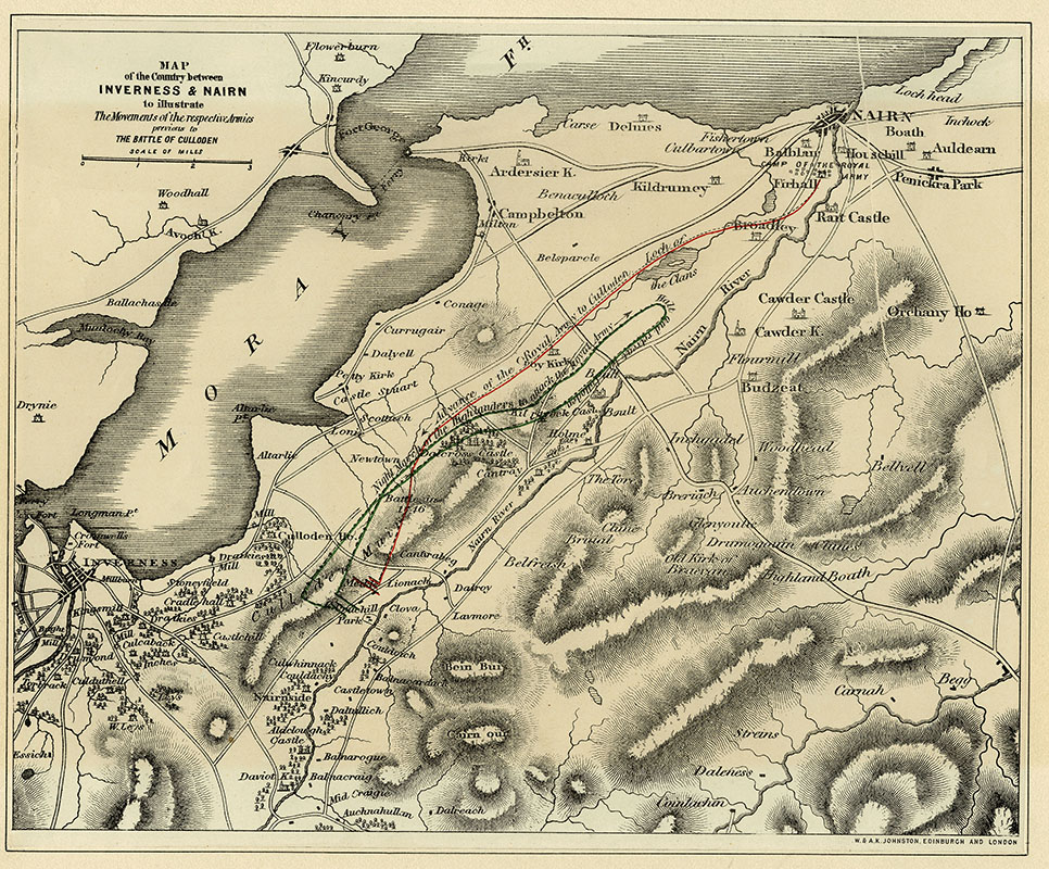 map of the area between Inverness and Nairn showing the movements of the respective armies prior to the Battle; (p) W & A K Johnston; 18 x 22.7 cms.