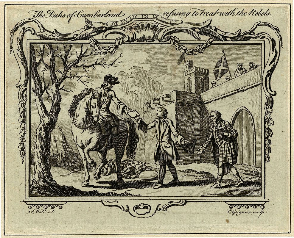 at Carlisle, on horseback returning packet to Englishman and Highlander outside the walls of the town; December 1745; (a) S Wale; (e) C Grignion; 8.5 x 10.7 cms.