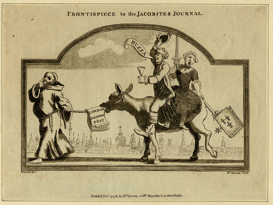 satirical frontispiece for Henry Fielding's satirical periodical which first appeared 5 December 1747 and ran until 5 November 1748, the plate designed by Hogarth was used for the first twelve numbers; (a) W Hogarth; (e) R Livesay; (p) R Livesay; 1781; 12.5 x 19.4 cms.
