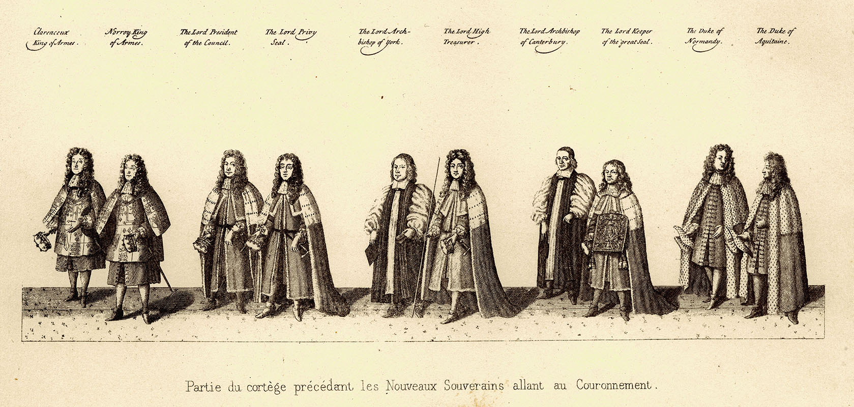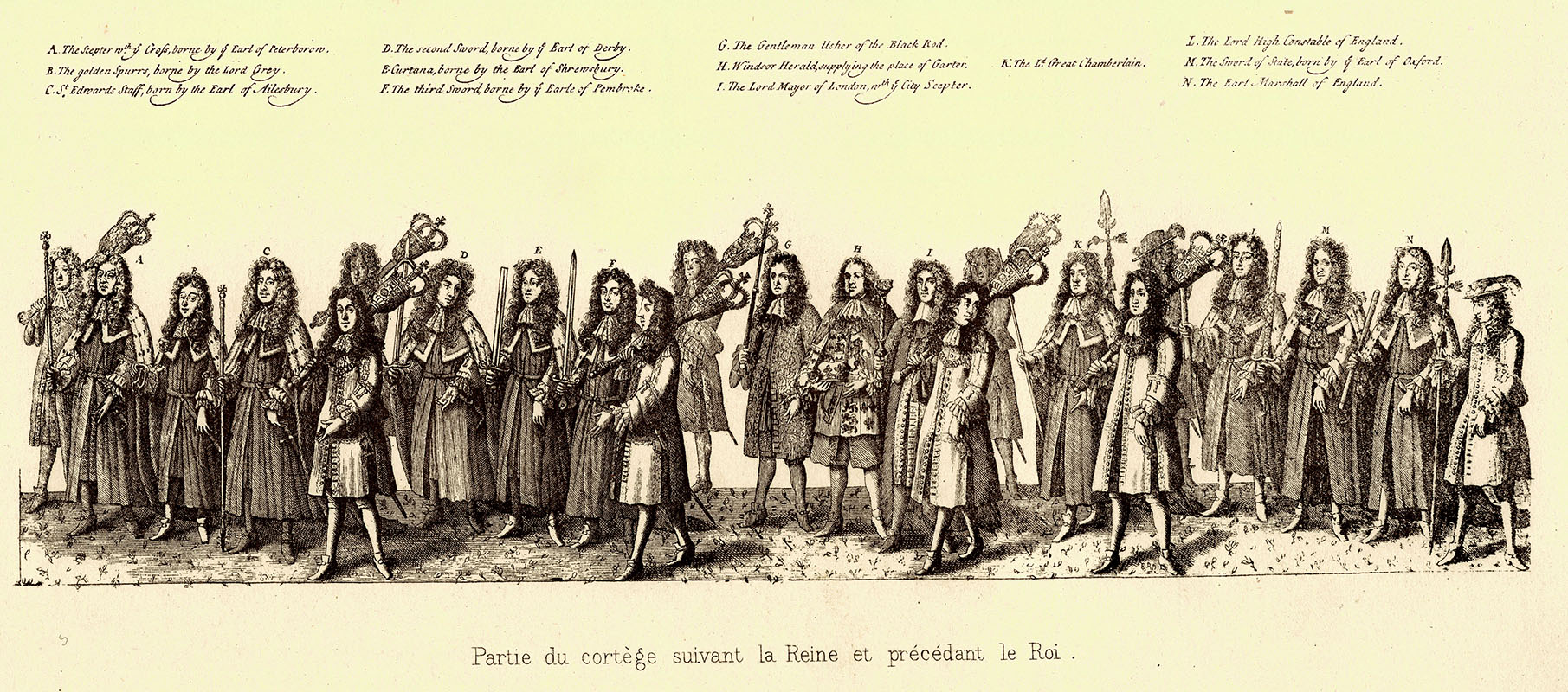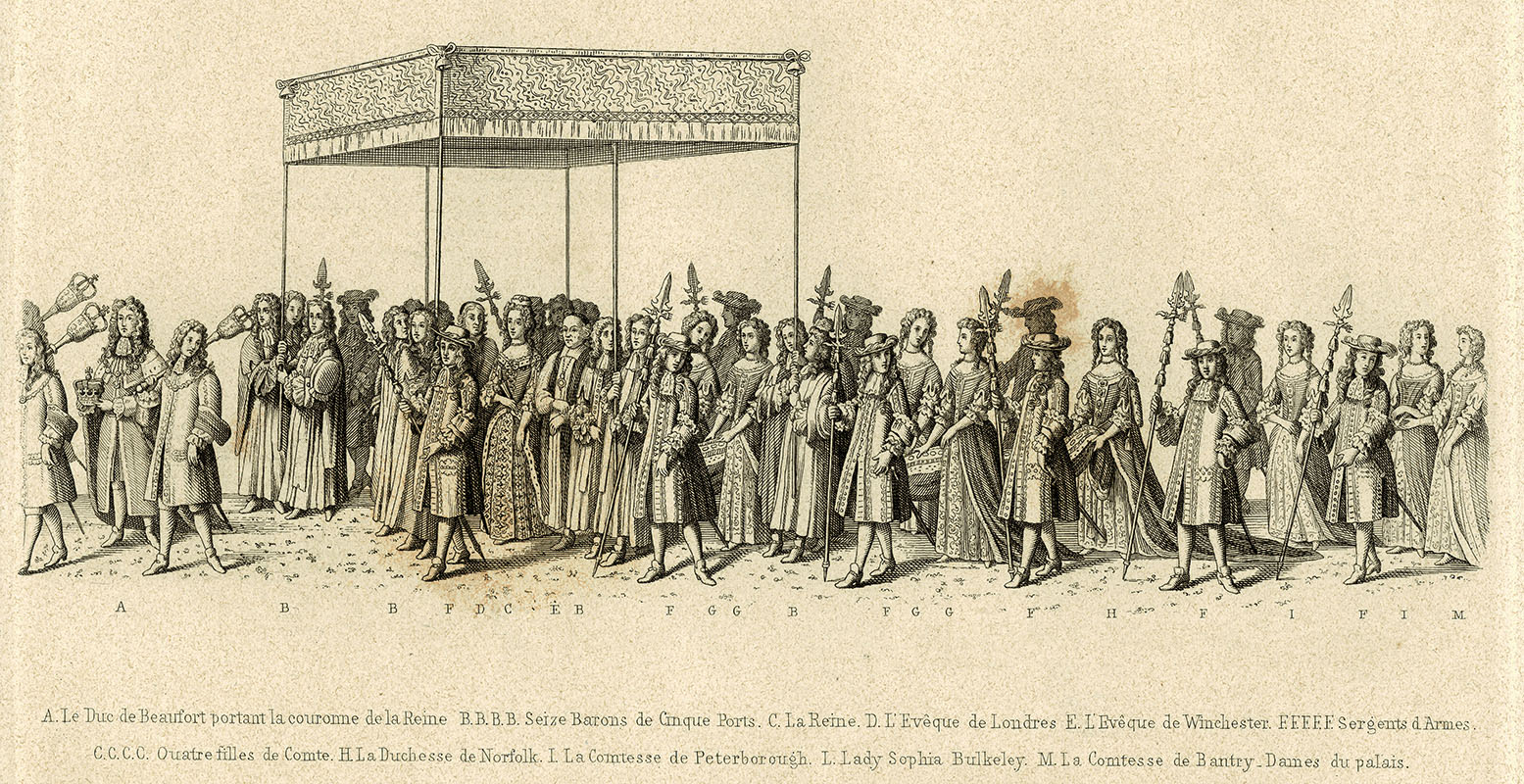 part of the procession following the Queen and preceding the King to the Coronation, Westminster Abbey, 23 April 1685; 8 x 22.5 cms.