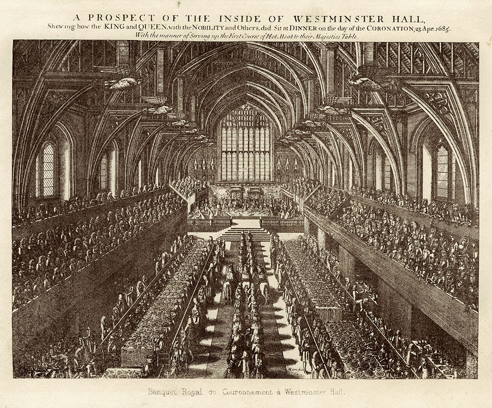 Coronation banquet at Westminster Hall, 23 April 1685; (e) S Moore; 14.8 x 20.5 cms.