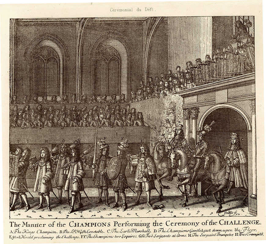 the Ceremony of the Challenge, featuring the King's Champion; (e) N Yeates; 15 x 18.4 cms.