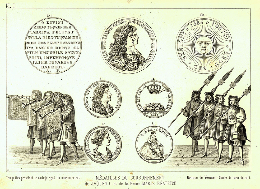 trumpeters preceding the royal Coronation procession, Coronation medals, group of Yeomen of the Guard, Coronation, 23 April 1685; 14.8 x 22 cms.