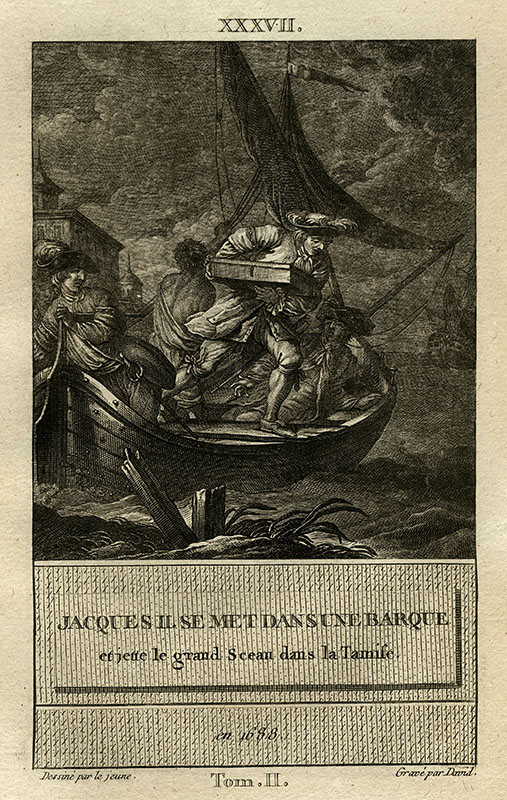 embarking for flight to France and throwing the Great Seal of England into the Thames, December 1688; (a) Le Jeune; (e) L David; 15 x 9.2 cms.
