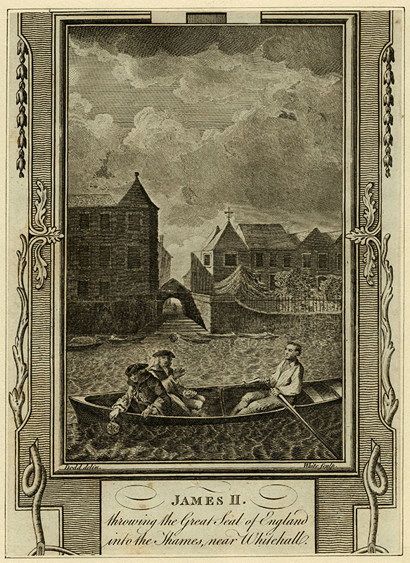 embarking for the flight to France and throwing the Great Seal of England into the Thames, December 1688; (a) D Dodd; (e) White; 21.4 x 15 cms.