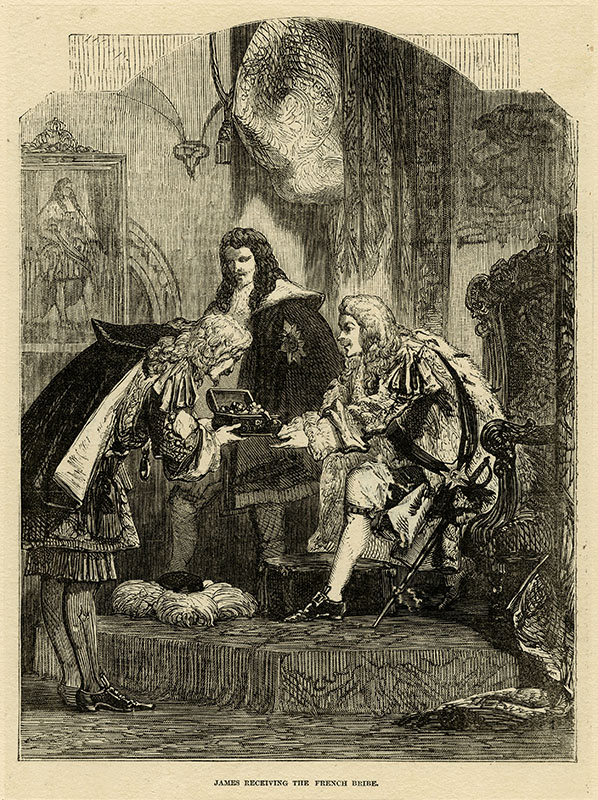 receiving the French bribe to ensure his loyalty to Louis XIV and the interests of France, 1685; (p) Cassell's Illustrated History of England Vol III [p 511], Cassell, Petter & Galpin; [1865-74]; 20.2 x 15.2 cms.