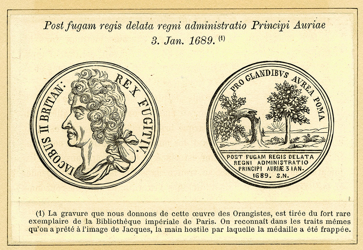 medal commemorating the Flight of James from England, 1688; 4.8 x 11.5 cms.