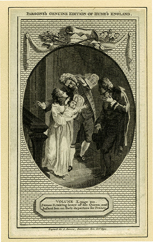 taking leave of his Queen and infant son, James Francis Edward, on their departure for France, December 1688; (p) J Parsons; 1794; 11.1 x 6.2 cms.