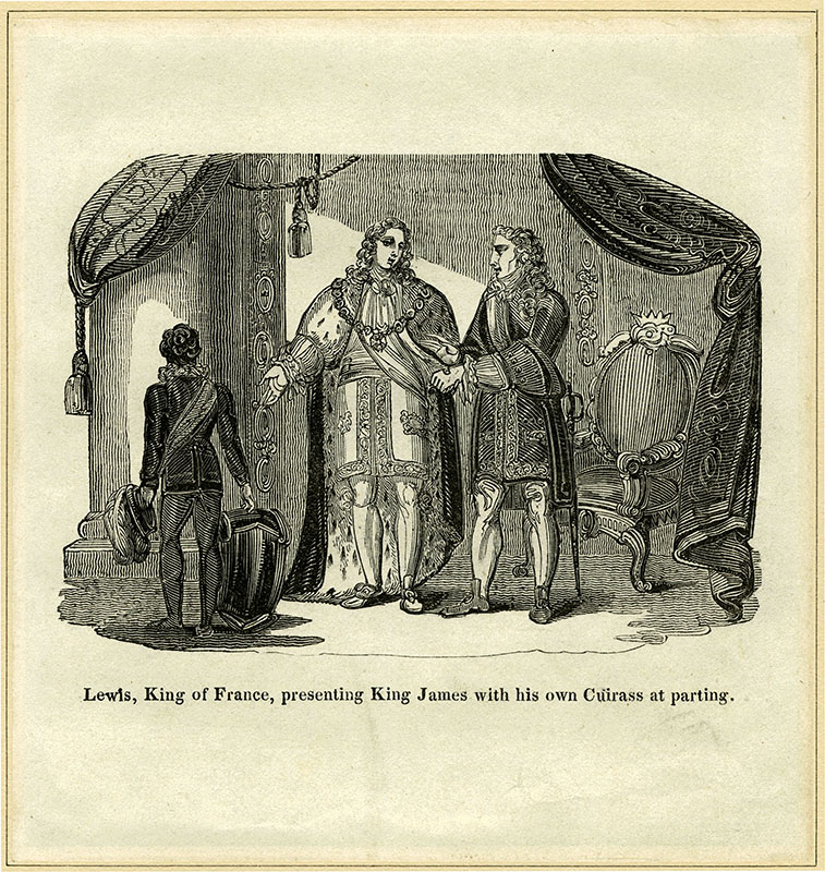 Louis presenting James with his own cuirass as James departs for Ireland, 1689; 7.6 x 10.6 cms.