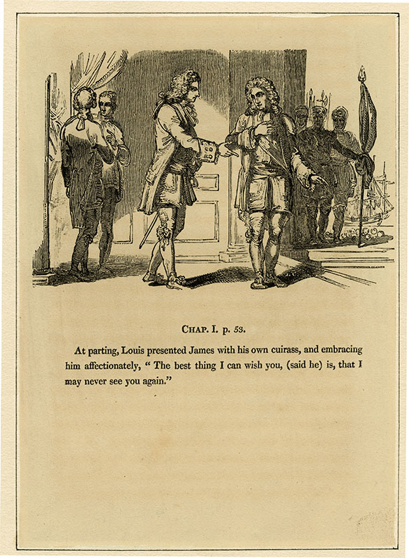Louis presenting James with his own cuirass as James departs for Ireland, 1689; 7.5 x 10.8 cms.