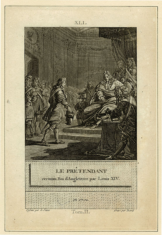 the Pretender acknowledged as King James III of England by Louis, 1701; (a) Le Jeune; (e) L David; 15 x 9.2 cms.