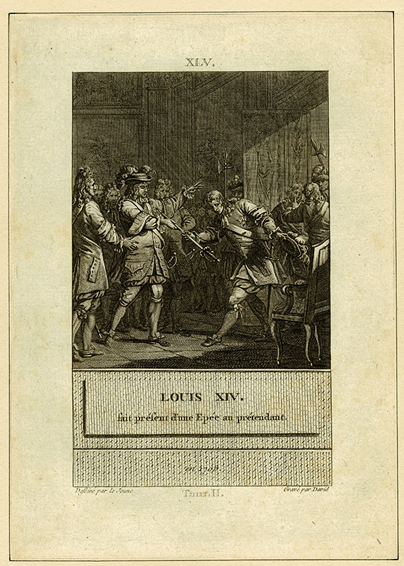 Louis presenting a sword to James, 1708; (a) Le Jeune; (e) L David; 14.9 x 9.3 cms.
