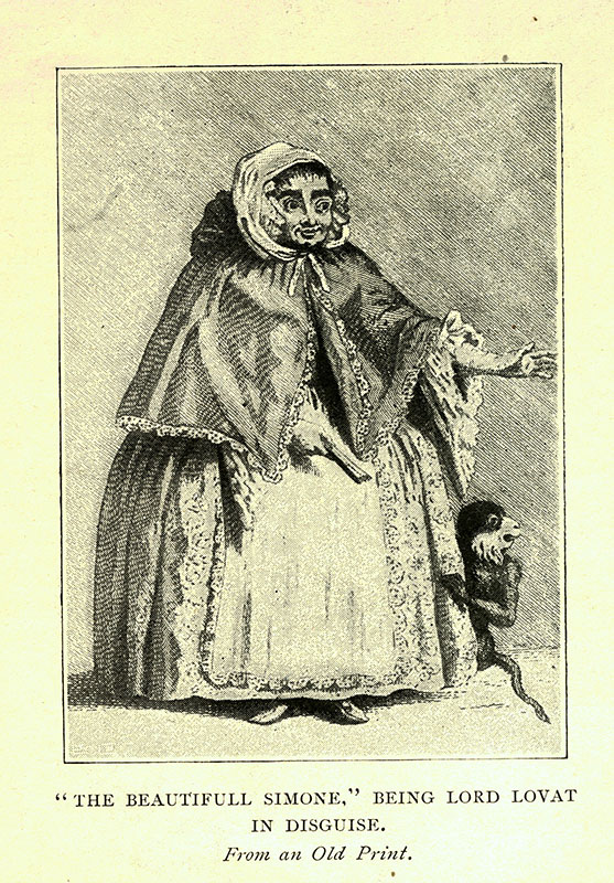 Jacobite intriguer, executed for high treason; dressed as a woman, 'The Beautifull Simone', with a monkey, satirical; 8.4 x 6 cms.