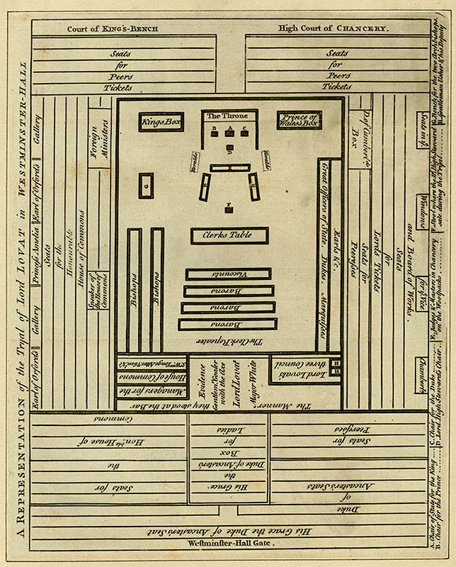 Jacobite intriguer, executed for high treason; plan showing the arrangements for seating at Lovat's trial in Westminster Hall; 19 x 23.5 cms.