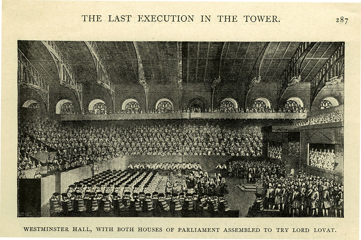 Jacobite intriguer, executed for high treason; the trial in Westminster Hall; 6.7 x 12.4 cms.