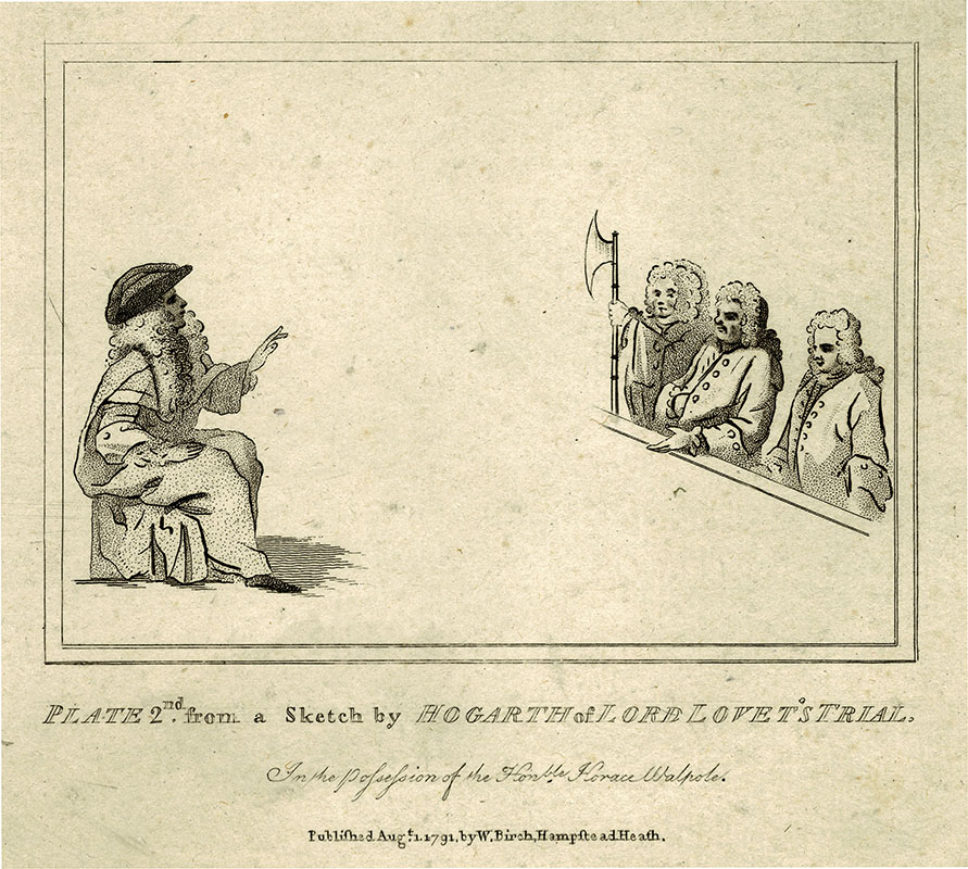Jacobite intriguer, executed for high treason; a sketch of the trial in Westminster Hall; (a) W Hogarth; (p) W Birch; 1791; 8.5 x 12.2 cms.