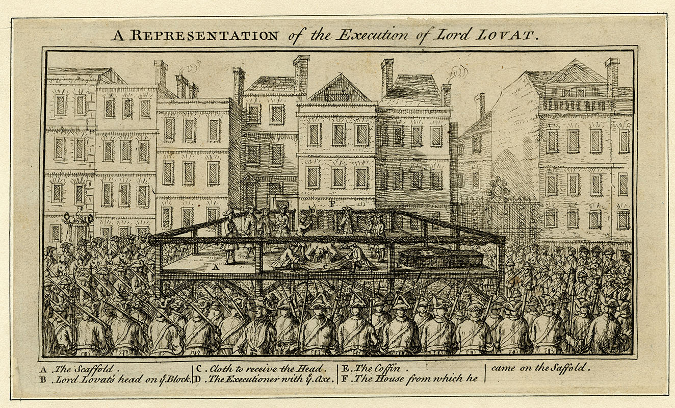 Jacobite intriguer, executed for high treason; the execution, Tower Hill, 9 April 1747, with key to main features of the action; 8.8 x 17 cms.