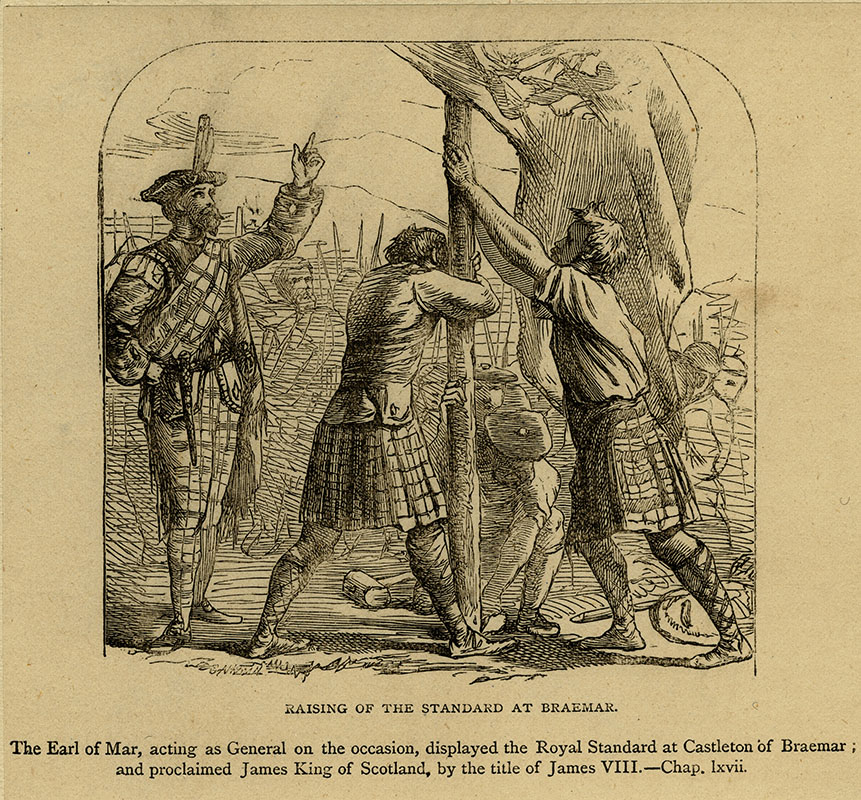 Jacobite leader; setting up James Edward, the Old Pretender's standard at Braemar, 1715; 8.5 x 8.6 cms.