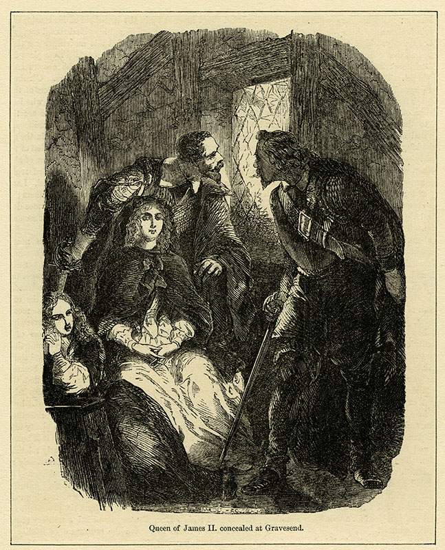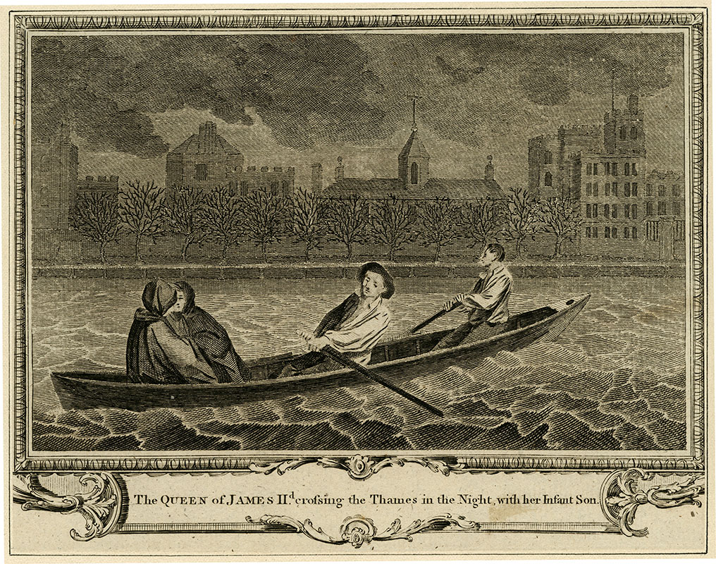 queen of James II; her flight from England to France with her son, James Francis Edward, the Prince of Wales, December 1688; 10.3 x 16.2 cms.