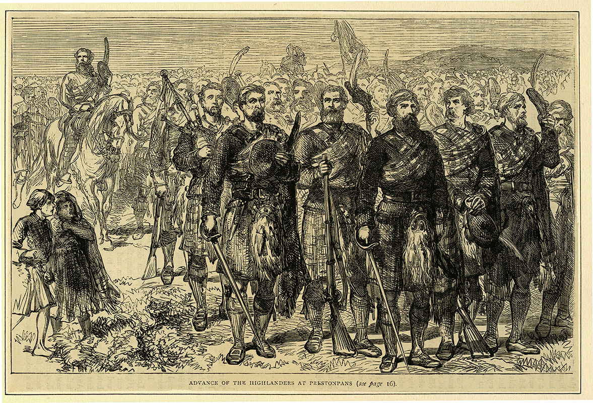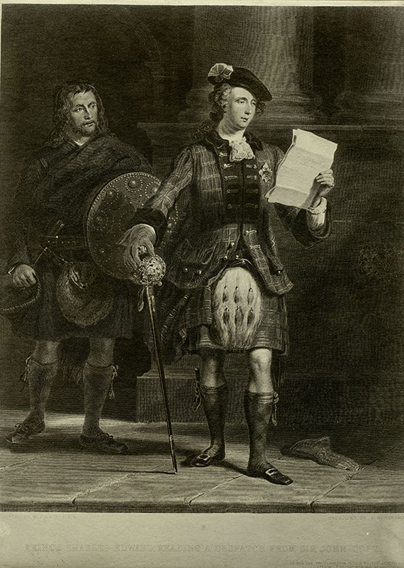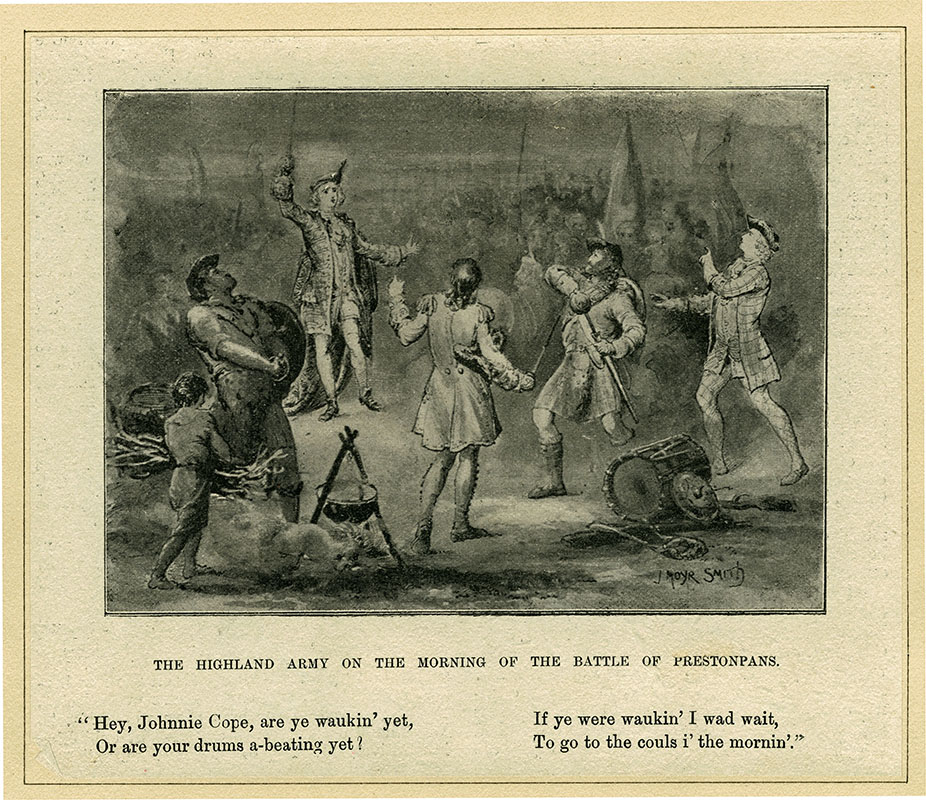 'Bonnie Charlie heads the Clans and wakes up Cope at Prestonpans'; (a) W Simpson; (e) S Williams; 8.7 x 12.3 cms.