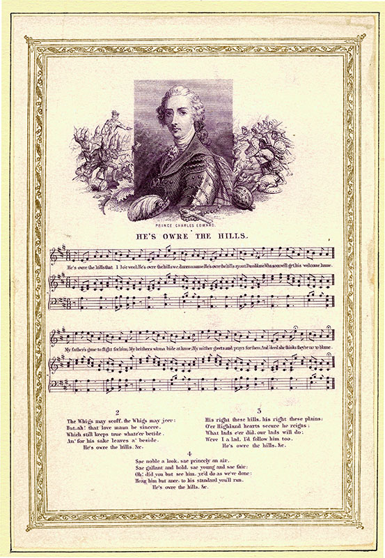 bust, in armour, with English soldiers to left, Highlanders to right, headpiece to the song and music of He's Owre The Hills; 14.5 x 9.6 cms.