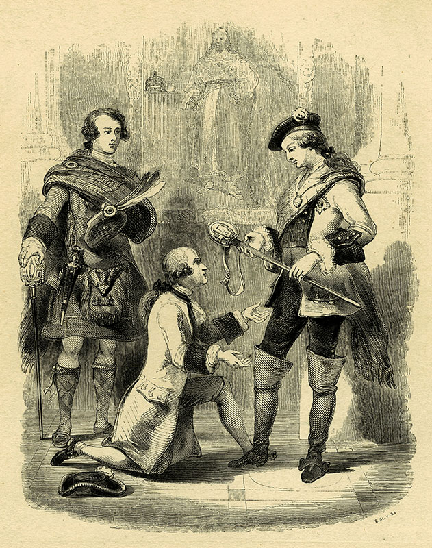 presenting sword to Waverley, watched by Fergus McIvor (Macdonnell of Glengarry) at Holyrood House, 1745; (a) W Simson; (e) S Sly; (p) to illustrate Sir Walter Scott's Waverley Vol II, [p 103], Fisher, Son & Co; 1836; 16 x 12 cms.