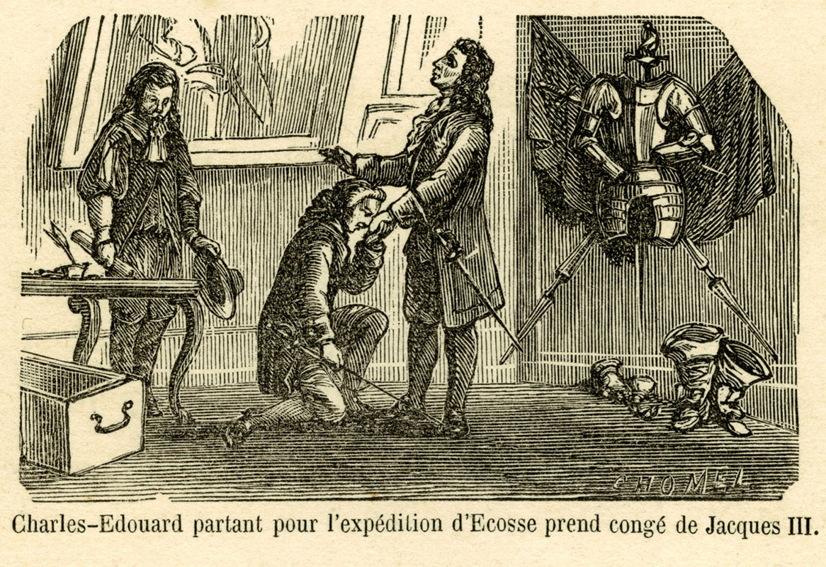 taking leave of his father, James Francis Edward, before departing for Scotland, 1745; (e) Chomel; 4.5 x 7.2 cms.