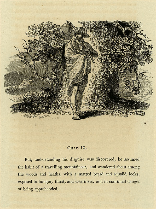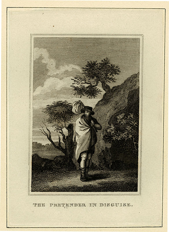 as a fugitive disguised as a traveller, after the Battle of Culloden, 1746; 8 x 10.4 cms.