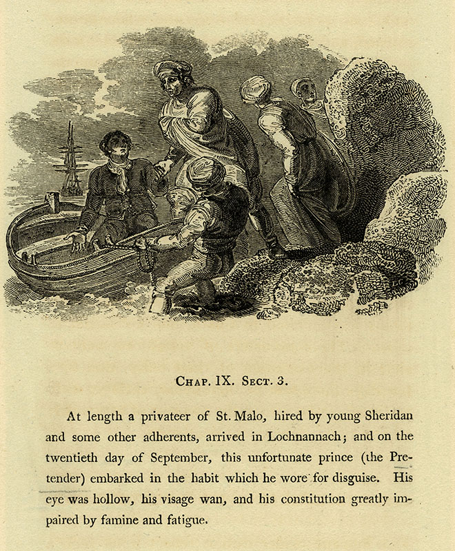 departure from Scotland for France, 20 September 1746; (a) R Smirke; (e) P Audinet; (p) J Stratford; 1811; 24 x 14.5 cms.